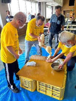 両市連合会で意見交換を行い、「八朔だんご馬」づくりを実演