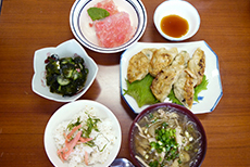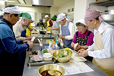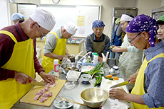 参加者約30名、たくさんの参加の中、女性顔負けの腕前で、楽しく料理を作りました。
