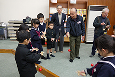 毎年恒例になっている行事で、子ども達に昔の遊び(こま回し、竹とんぼ、おじゃみ、羽子板等)を教えに訪問しています。子ども達も初めての体験に大喜びでした。