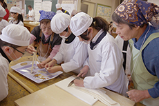 「さぬきの本場」うどん打ちでは毎年宇多津町の「おか泉」さんが訪問し、うどんづくりを一から教えていただいています。子ども達も真剣に取り組んでいました。